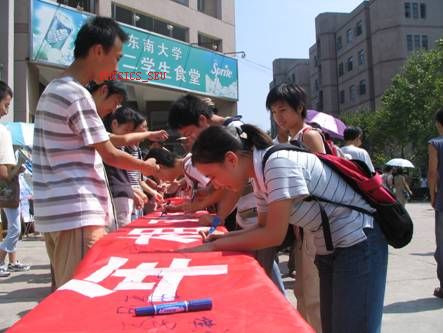 活动简介:为了扩大“纪念世界物理年”系列活动在我校的影响,我们在浦口校区举行了大型横幅签名活动,吸引了全校同学的热情参与,获得师生的广泛支持。同时,为了让每一位关心物理年的老师或学生有一份纪念,现场我们进行了物理年纪念版笔记本限量发放。