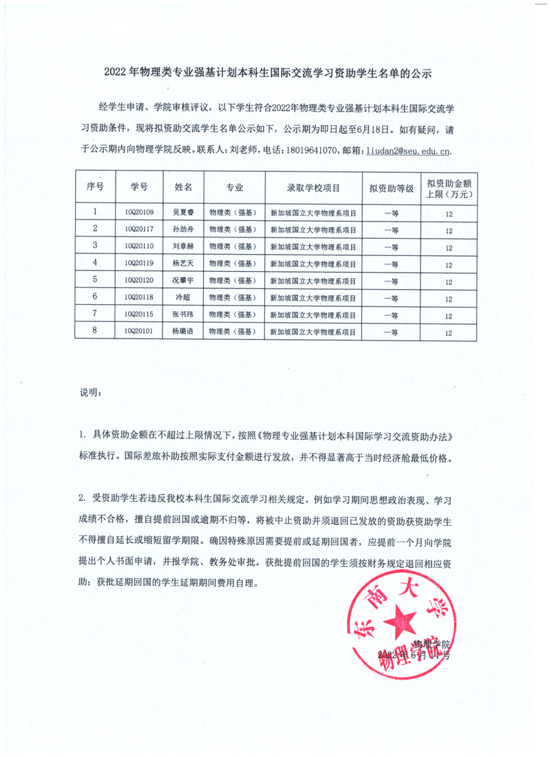 2022物理类专业强基计划本科生国际交流学习资助学生名单的公示